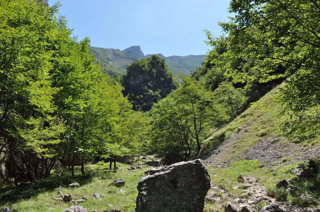 You can even reach Monte Amaro, but you must be properly equipped. The ascent takes nine hours, so it is necessary to stay overnight before returning. In any case, we pass the second fountain as well (after enjoying a good drink) and continue deeper into the forest. We often stop to photograph everything around us. Not only the landscapes (beautiful, by the way) but also the many flowers found here and the hundreds (yes, really hundreds) of butterflies of all colours flying around us, not shy at all. After a bit more walking we reach Bocca dei Valloni, where we find yet another table, at which we finally sit for a well‑deserved rest (and above all because it is sandwich time at last!). It is strange to find a table here.