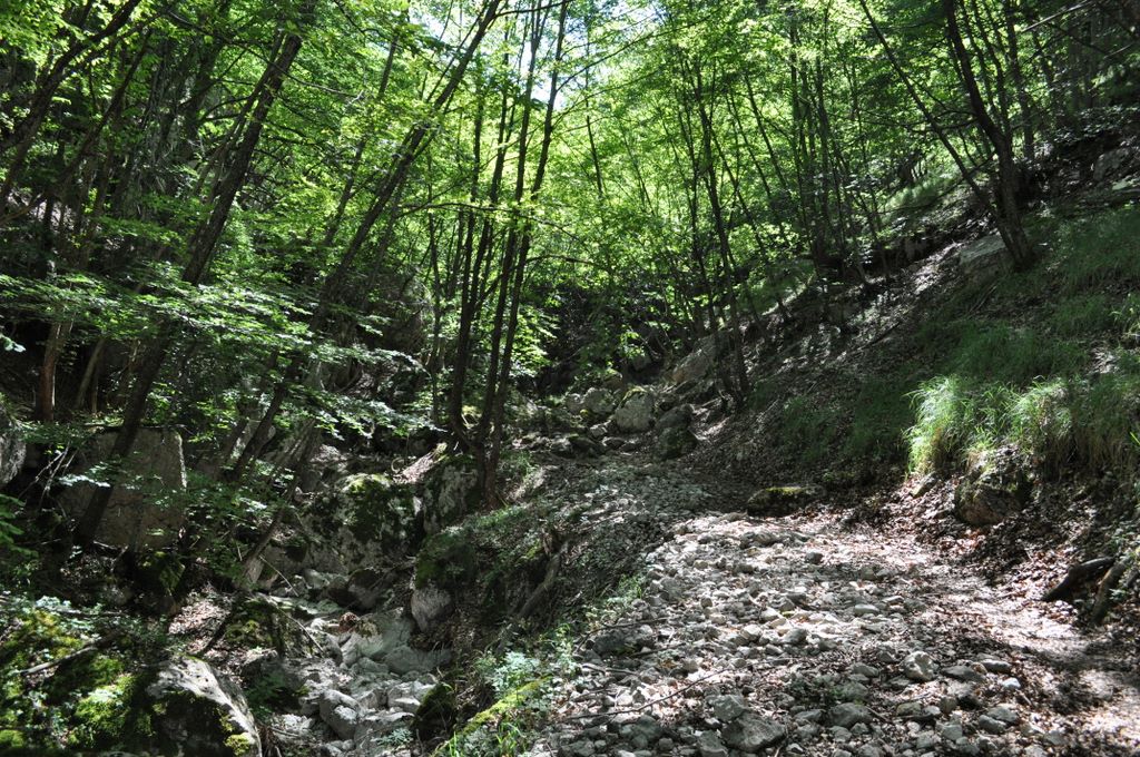 We continue on our way. It is actually quite hot, and being inside a gorge is noticeable because there is no breeze at all, and now that we are in the sun the temperature rises. But no worries… once you reach the shade everything changes and it feels great! The landscape is quite varied, alternating rocky and exposed stretches with dense, cool woodland. After a bit more walking we reach the second fountain. Here too there are benches and tables, this time in the cool of the forest. Many people have chosen this point as the destination of their walk. The beauty of this place is that you can choose how long your walk will be thanks to these “intermediate goals”. You can stop at the first fountain, the second, or continue to Bocca dei Valloni (where we went) or even further.