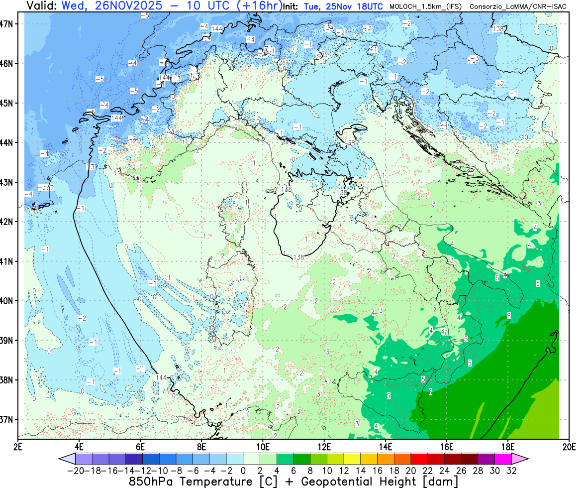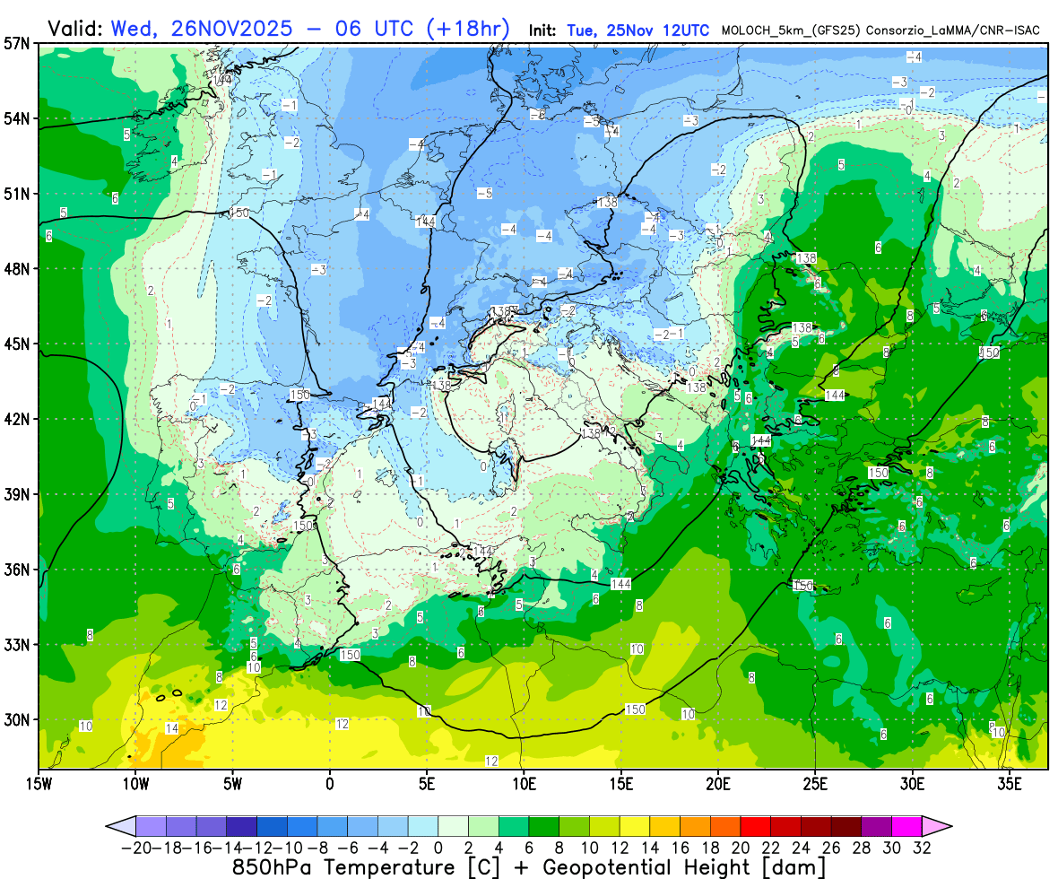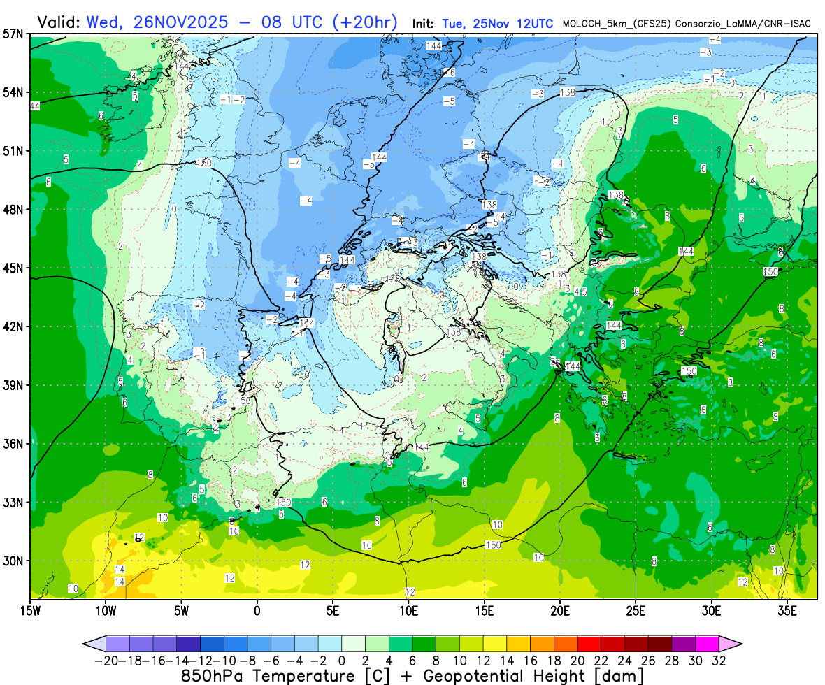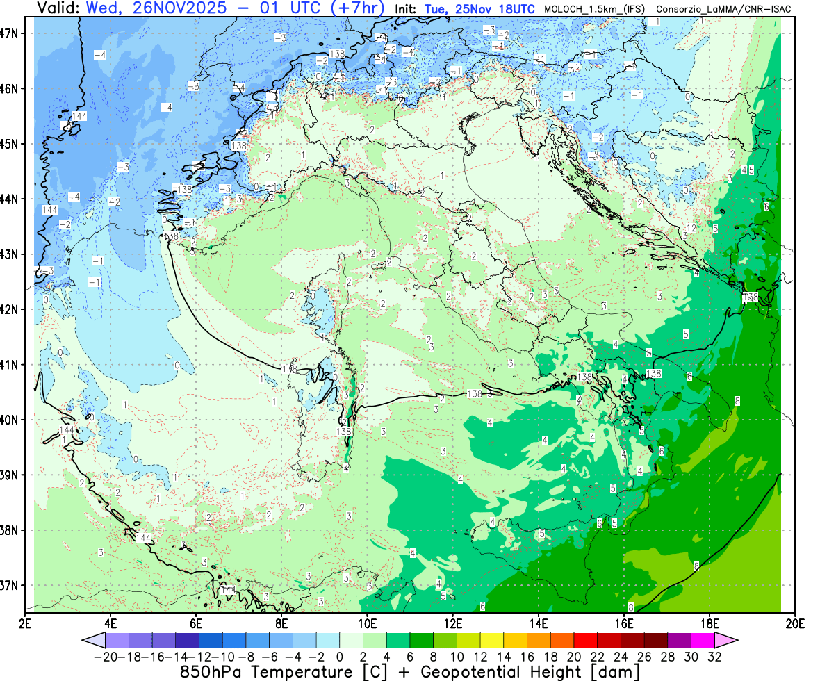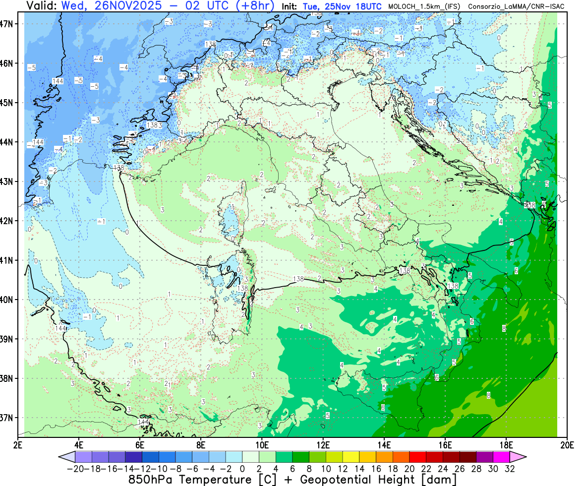 Gradi 8,6 C°, umidità relativa 85%, punto di rugiada 7.30 C° - Data: "Nov 25 2025 2:00 AM"