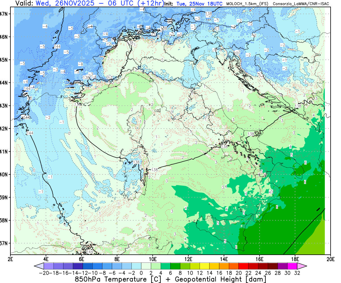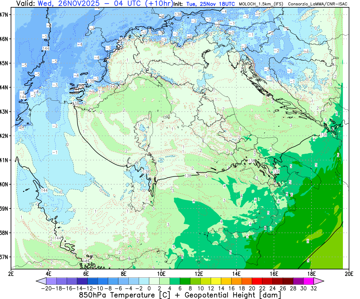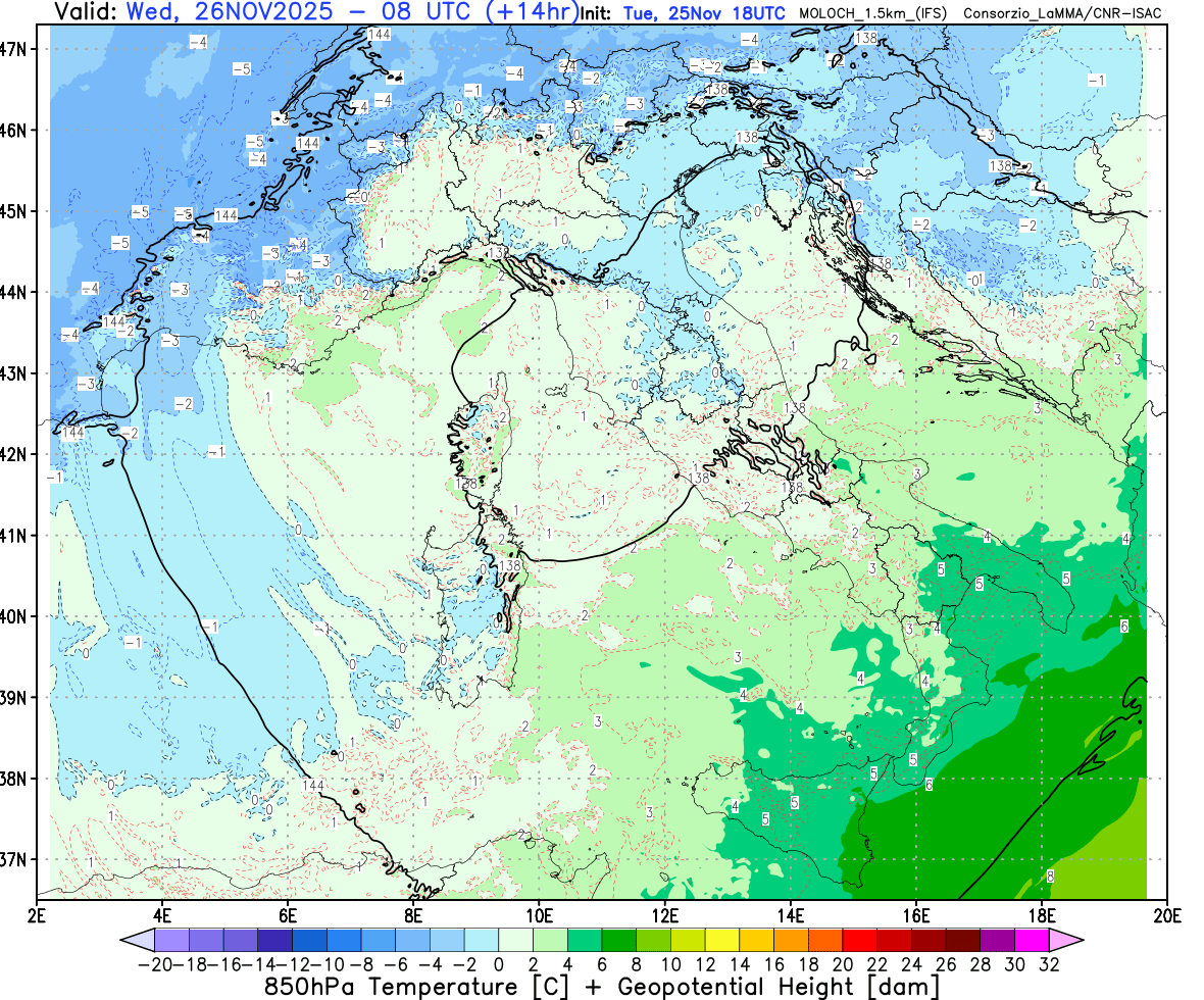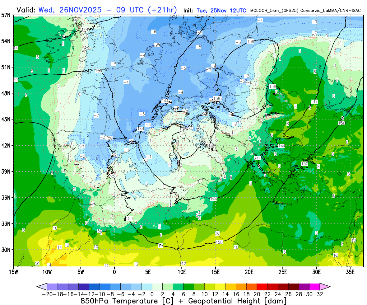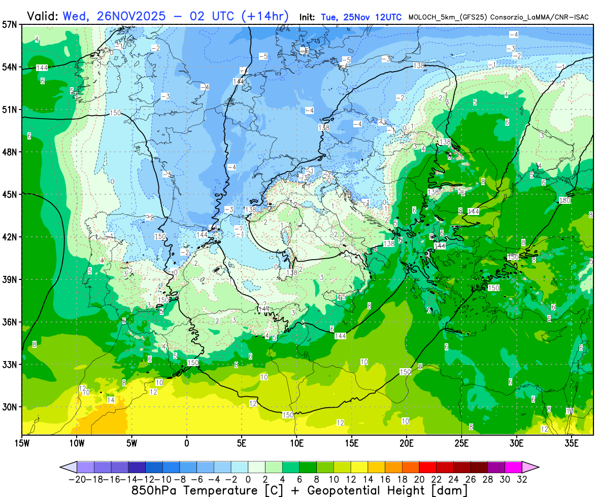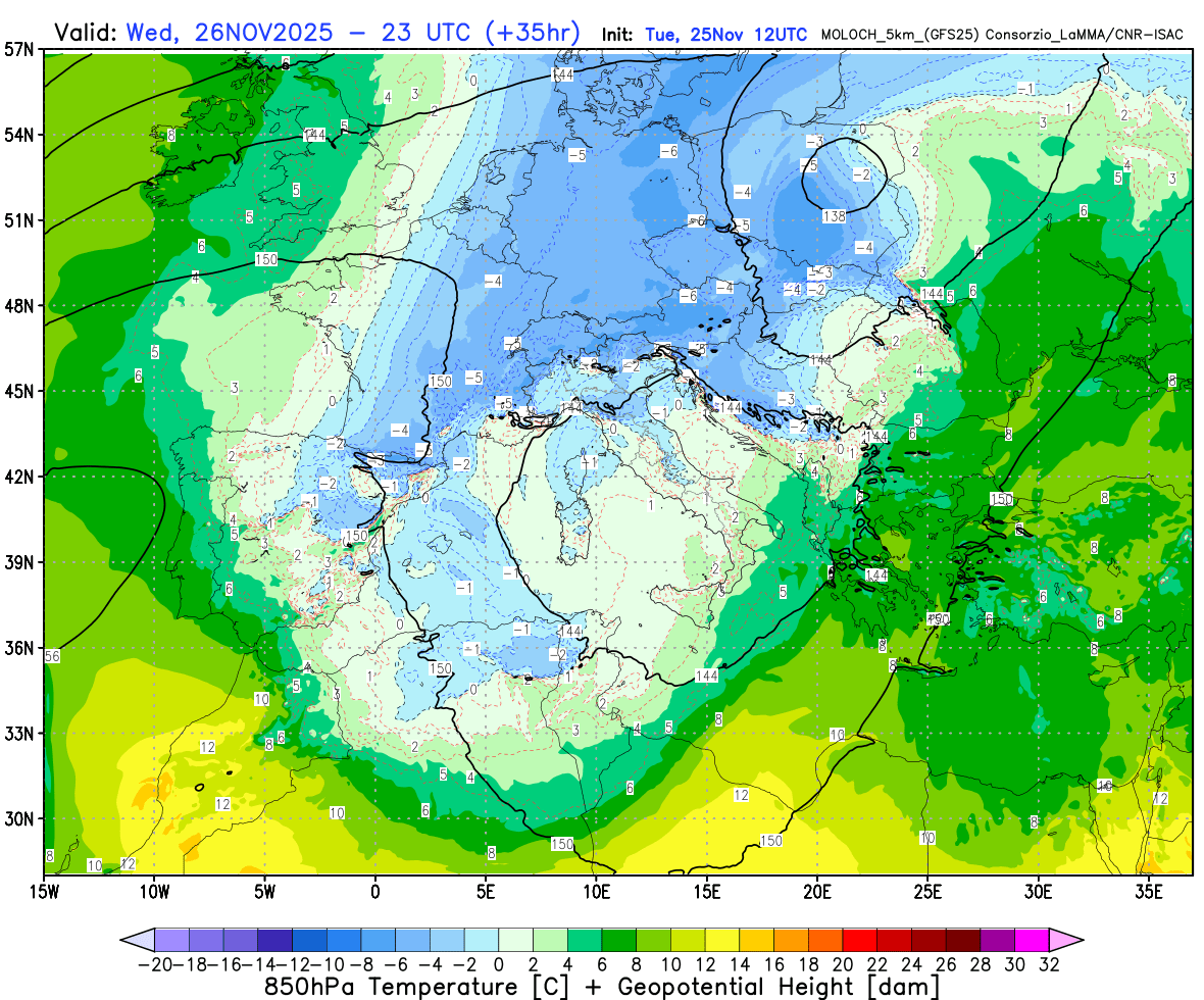 Gradi 8,6 C°, umidità relativa 85%, punto di rugiada 7.30 C° - Data: "Nov 25 2025 2:00 AM"