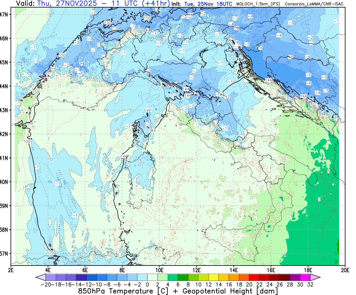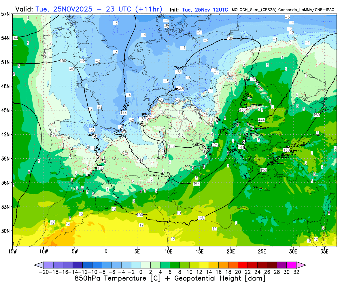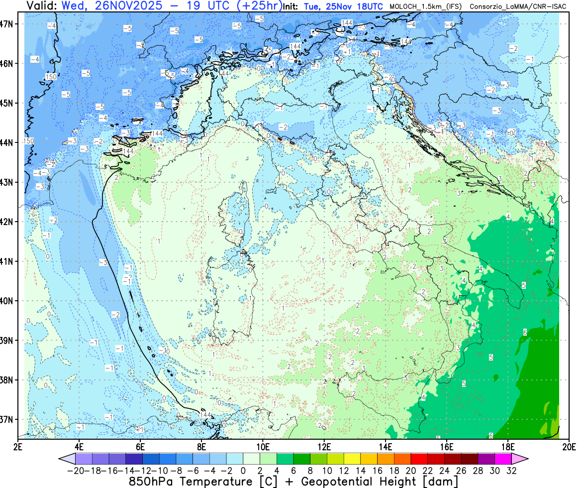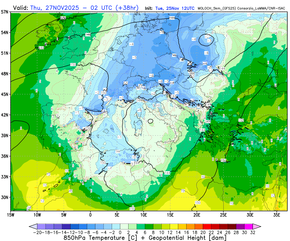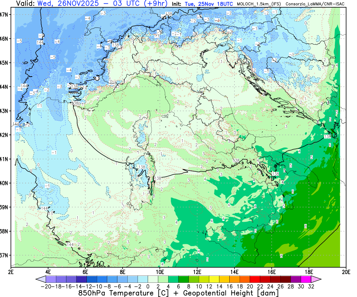 Gradi 8,6 C°, umidità relativa 85%, punto di rugiada 7.30 C° - Data: "Nov 25 2025 2:00 AM"