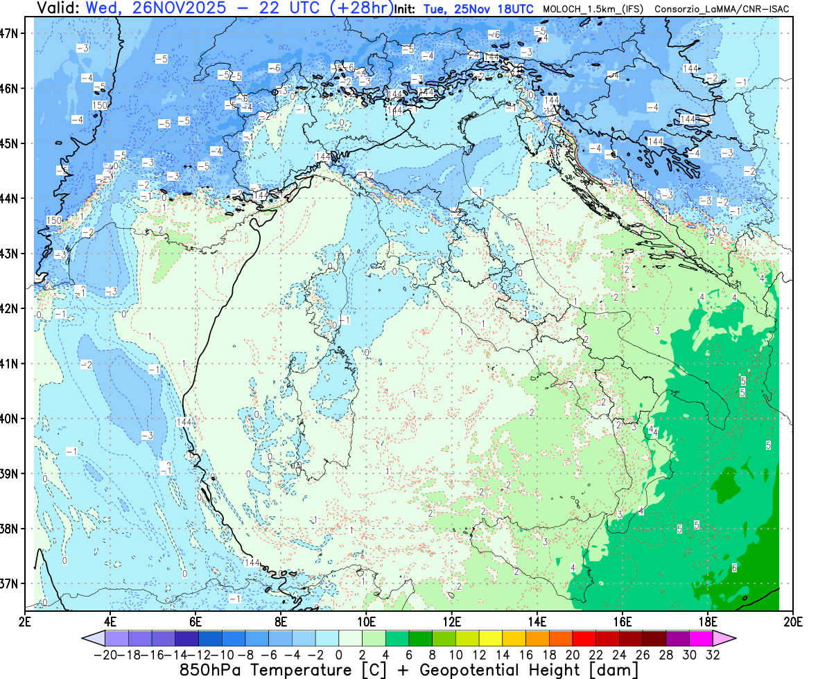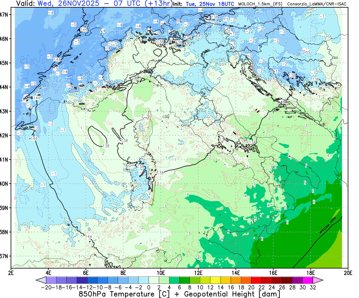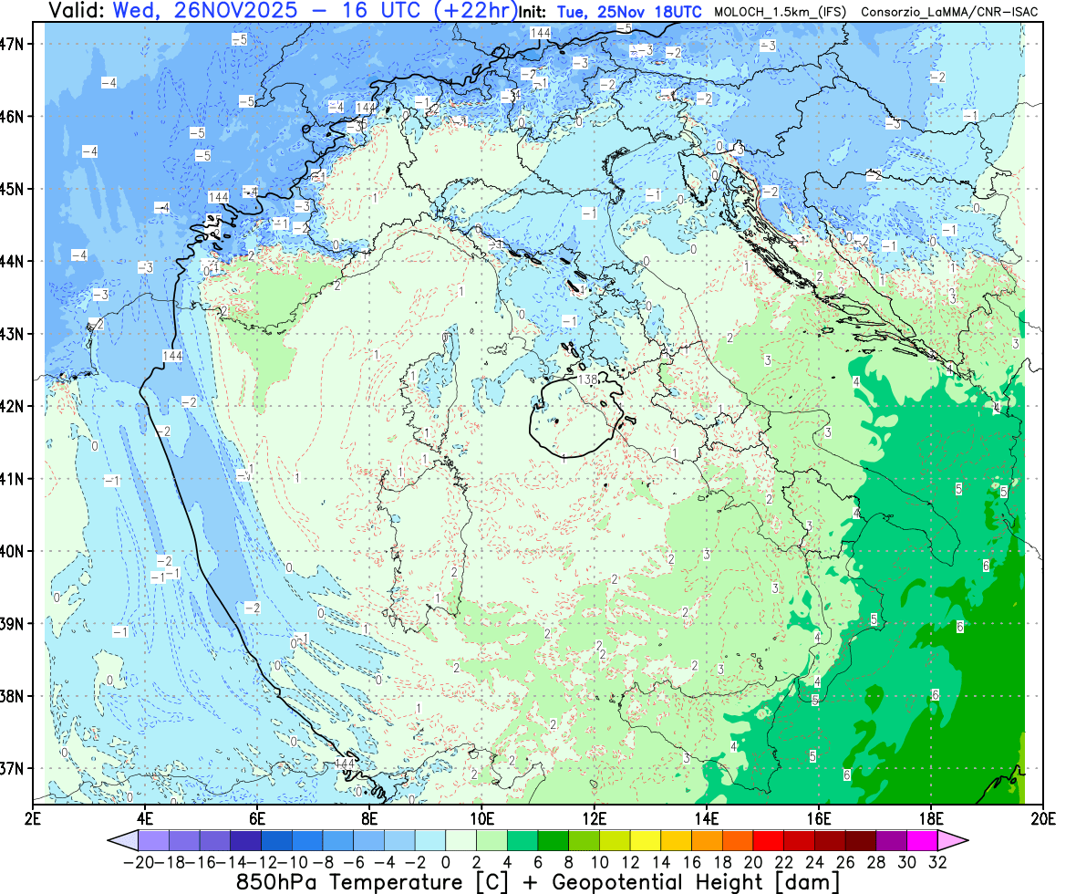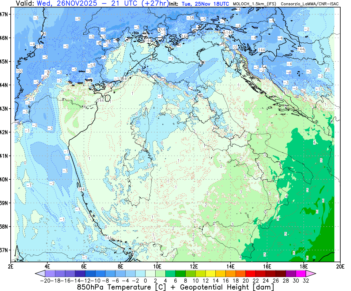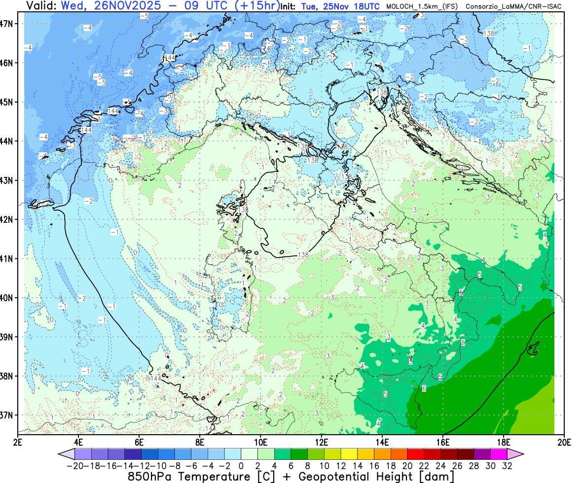 Gradi 8,6 C°, umidità relativa 85%, punto di rugiada 7.30 C° - Data: "Nov 25 2025 2:00 AM"