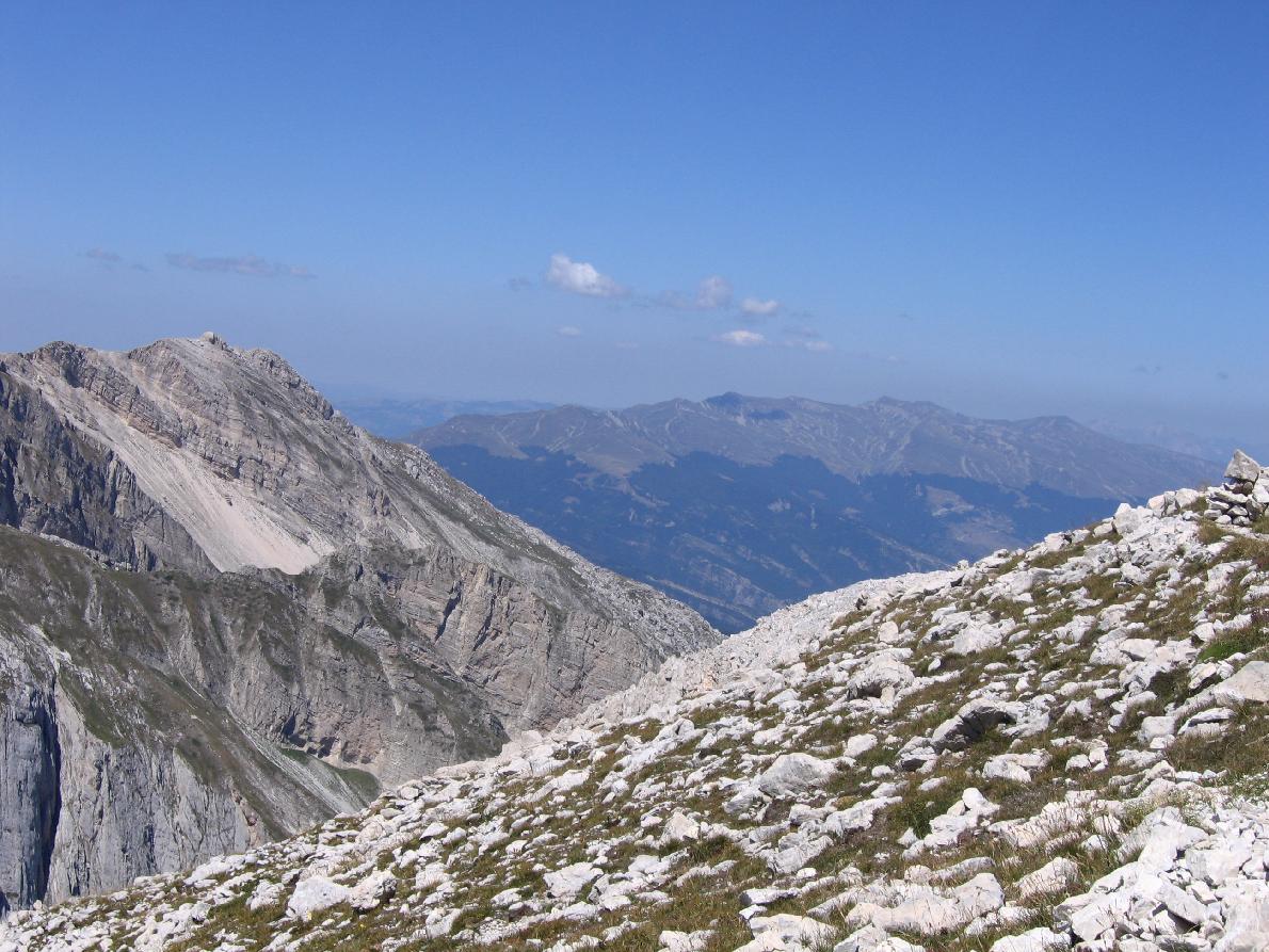 Der letzte Abschnitt führt über steiles Geröll und Felsstufen, mit einigen Passagen, in denen die Hände zur Balance nötig sind. Der Gipfel des Corno Grande bietet ein außergewöhnliches Panorama über den Gran Sasso, die Maiella, das Velino–Sirente‑Massiv und an klaren Tagen bis zur Adria.