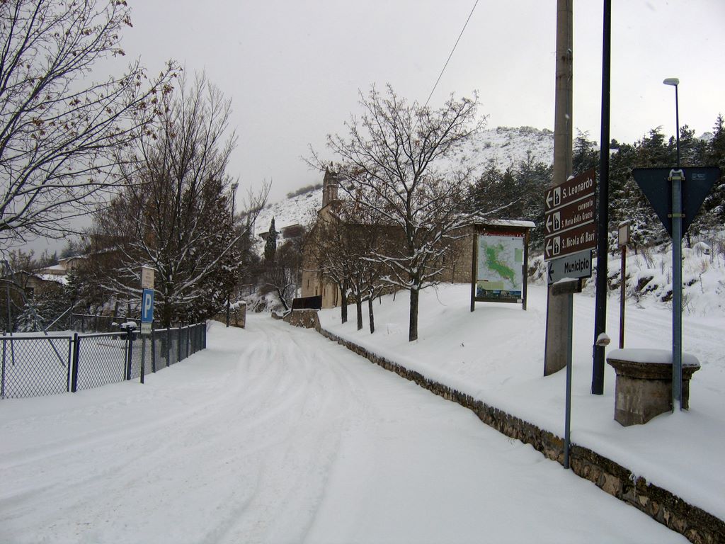 A medida que ganamos altitud, empezamos a encontrar algo de nieve: una sorpresa muy agradable, ya que este año aún no hemos visto una nevada en condiciones. El primer pueblo que encontramos es Santo Stefano di Sessanio. Al ser festivo, el ambiente es animado y lleno de vida. Lo atravesamos sin adentrarnos en sus callejuelas, pero incluso así su alma medieval es evidente: casas de piedra apretadas unas contra otras y una atmósfera auténtica, cuidada con esmero por sus habitantes. Dejamos atrás Santo Stefano y seguimos por esta “carretera de las maravillas”.