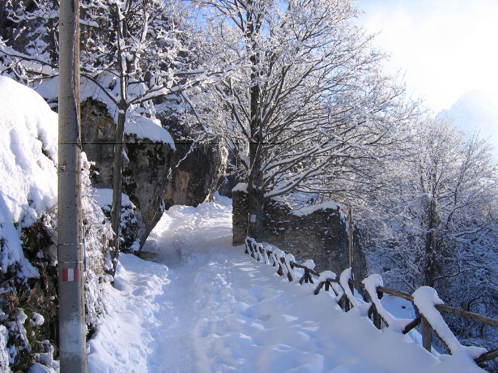 Quindi, diretti ai Prati di Tivo, scopriamo (meglio dire scopro.... credo che mio marito compagno di viaggio conoscesse già i segreti della zona) che per la precisione stiamo andando a "Prati di Tivo - Contrada di Pietra Camela". Un paese qui? Proprio nel mezzo della montagna? Ebbene si. E non un paese qualsiasi, ma il paese di Heidi! E' il vero e proprio paese di montagna! Si sviluppa in salita, circondato da monti e boschi; le case sono tutte vicine vicine, tutte in pietra, con le finestrelle di legno dalle quali spuntano esitanti delle piantine che hanno resistito ai rigori dell'inverno; le strade non sono altro che delle strette salite (o spesso scalinate) nelle quali passano appena due persone affiancate e dunque.... meraviglia delle meraviglie.... niente macchine, niente motorini, addirittura inagibili alle biciclette. Intorno a noi solo natura, silenzio, pace ed un paesaggio mozzafiato. Saliamo fino alla fine del paese per scoprire che la strada (ormai un vero e proprio sentiero) prosegue inoltrandosi nel bosco e sulla montagna. Supponiamo che porti proprio alla nostra prima meta (i Prati di Tivo) ma è inverno e non conosciamo la zona quindi decidiamo (che saggi!) di non avventurarci su per questa strada mi di tornare alla macchina per arrivare a destinazione in maniera più comoda e sicura (per quanto sicuramente meno suggestiva). Ci ripromettiamo però di tornare qui in estate e di percorrere il sentiero fatato che abbiamo appena lasciato.