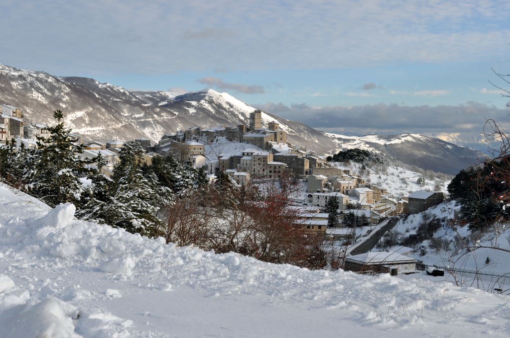 Wir fahren weiter bergauf und lassen ein weiteres kleines Paradies hinter uns. Nach einigen Kurven erscheint das dritte Dorf unserer Route: Castel del Monte. Es ist einer unserer Lieblingsorte. Auch wenn wir oft hierher kommen, berührt es uns jedes Mal, wenn es zwischen den Bergen auftaucht. Wir halten für ein Panoramafoto an und nutzen die viel vorhandene Schneelandschaft für weitere Aufnahmen. Wir essen hier zu Mittag und genießen die winterliche Atmosphäre.