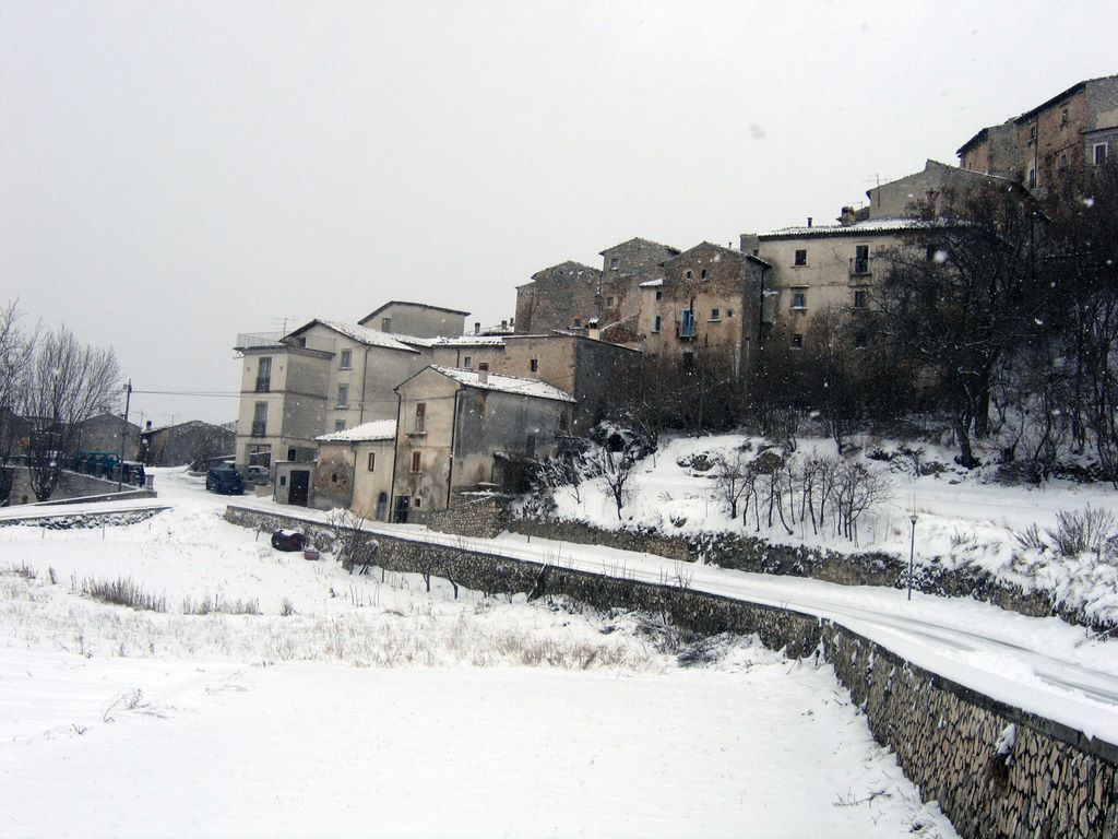 Je höher wir kommen, desto mehr Schnee entdecken wir — eine schöne Überraschung, denn in diesem Jahr haben wir noch keinen richtigen Schneefall erlebt. Das erste Dorf, das wir erreichen, ist Santo Stefano di Sessanio. Da es ein Feiertag ist, herrscht viel Betrieb. Wir fahren nur hindurch, ohne in die engen Gassen abzubiegen, doch selbst so ist seine mittelalterliche Seele unverkennbar: Steinhäuser dicht an dicht, eine Atmosphäre, die von den Bewohnern liebevoll bewahrt wird. Wir verlassen Santo Stefano und folgen weiter dieser „Straße der Wunder“.