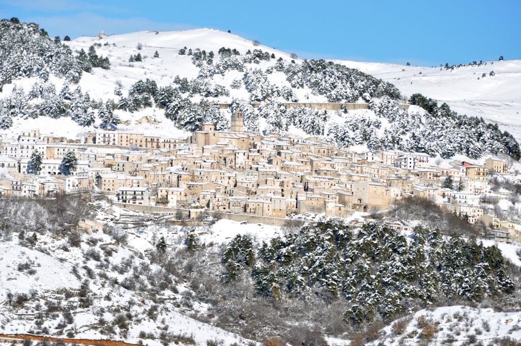 En prenant de l’altitude, nous trouvons un peu de neige — une agréable surprise, car cette année nous n’avons pas encore assisté à une vraie chute de neige. Le premier village que nous atteignons est Santo Stefano di Sessanio. Comme c’est un jour férié, le bourg est animé. Nous le traversons sans entrer dans les ruelles, mais même ainsi, son âme médiévale est évidente : maisons en pierre serrées les unes contre les autres, atmosphère authentique soigneusement préservée par ses habitants. Nous quittons Santo Stefano et poursuivons sur cette « route des merveilles ».