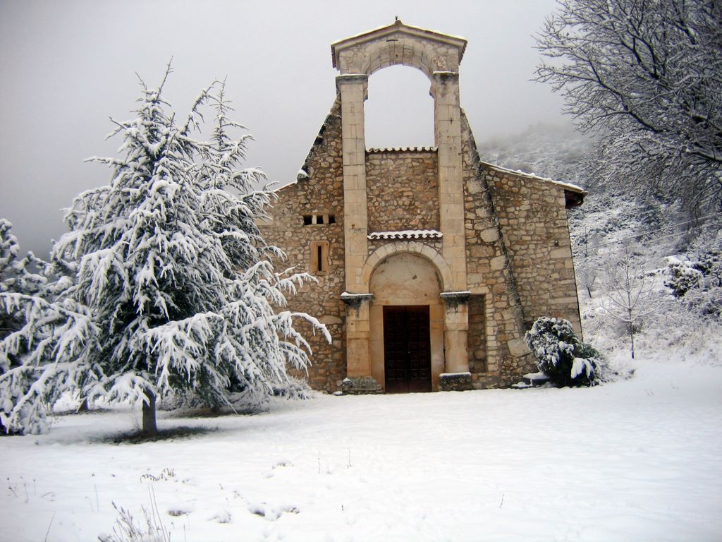 Wir fahren weiter bergauf und lassen ein weiteres kleines Paradies hinter uns. Nach einigen Kurven erscheint das dritte Dorf unserer Route: Castel del Monte. Es ist einer unserer Lieblingsorte. Auch wenn wir oft hierher kommen, berührt es uns jedes Mal, wenn es zwischen den Bergen auftaucht. Wir halten für ein Panoramafoto an und nutzen die viel vorhandene Schneelandschaft für weitere Aufnahmen. Wir essen hier zu Mittag und genießen die winterliche Atmosphäre.